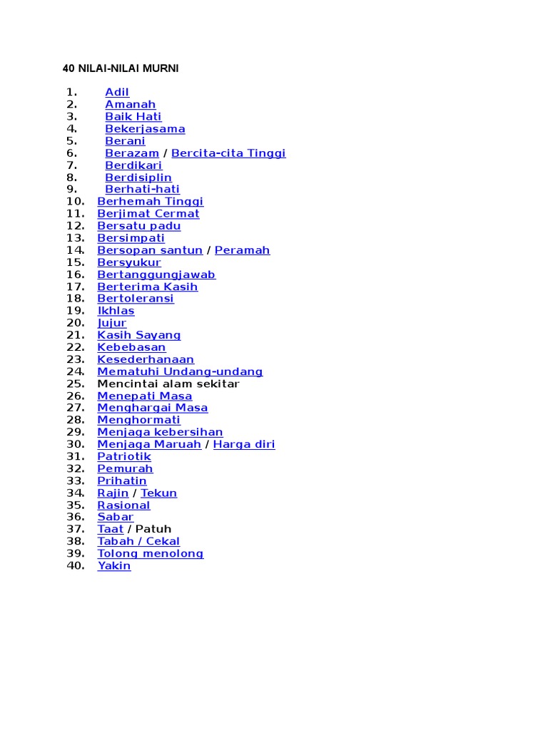 Nilai moral adalah bentuk gambaran objektif atas sisi kebenaran yang senantiasa dijalankan oleh seseorang di dalam lingkungan bermasyarakat, oleh karena itulah muncul. Nilai nilai murni dalam pendidikan moral sekolah menengah laman blog pendidikan moral: Nilai berkaitan dengan perkembangan diri nilai. Nilai murni pendidikan moral bidang pembelajaran 1 : Seseorang yang beretika bersifat rajin, adil, dan bertimbang rasa.